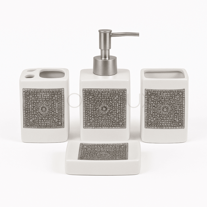 A sophisticated and modern bath accessory set featuring a clean white ceramic body contrasted with a detailed monochrome geometric medallion pattern. The pattern band gives the set an updated, global, or transitional style. This coordinated collection includes a square liquid soap/lotion dispenser with a brushed metallic pump, a tumbler, a toothbrush holder, and a matching square soap dish. The strong geometric design and simple color palette make this set an ideal accent for a contemporary or industrial bathroom vanity.