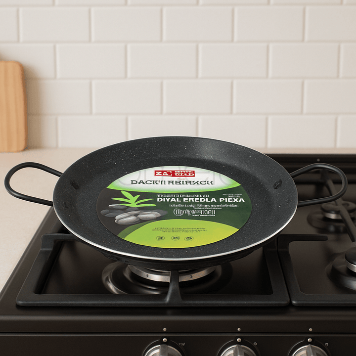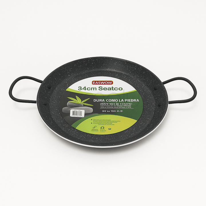 A large, diameter Seafood Pan from Byol featuring a durable stone-effect non-stick coating for superior food release and easy cleaning. Designed with two sturdy wire handles for secure lifting and transport, this pan is ideal for cooking large seafood dishes, paellas, or family-sized meals. Its construction is suited for various kitchen surfaces, ensuring reliable, long-lasting performance.