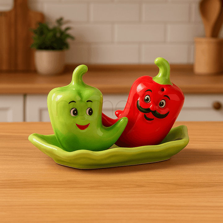 A whimsical and colorful seasoning set featuring two shakers shaped like chilli peppers (or bell peppers) and a matching tray. The set includes a green pepper shaker with a cheerful face and a red pepper shaker with a painted moustache, adding a fun, personality-driven element to your dining experience. The shakers sit on a lime-green, leaf-shaped ceramic tray that catches any spice spills and keeps the set together. This novelty set is perfect for anyone who loves cooking, spicy food, or wants a vibrant, conversation-starting centerpiece.