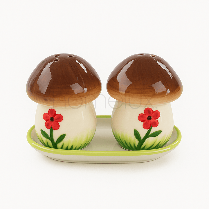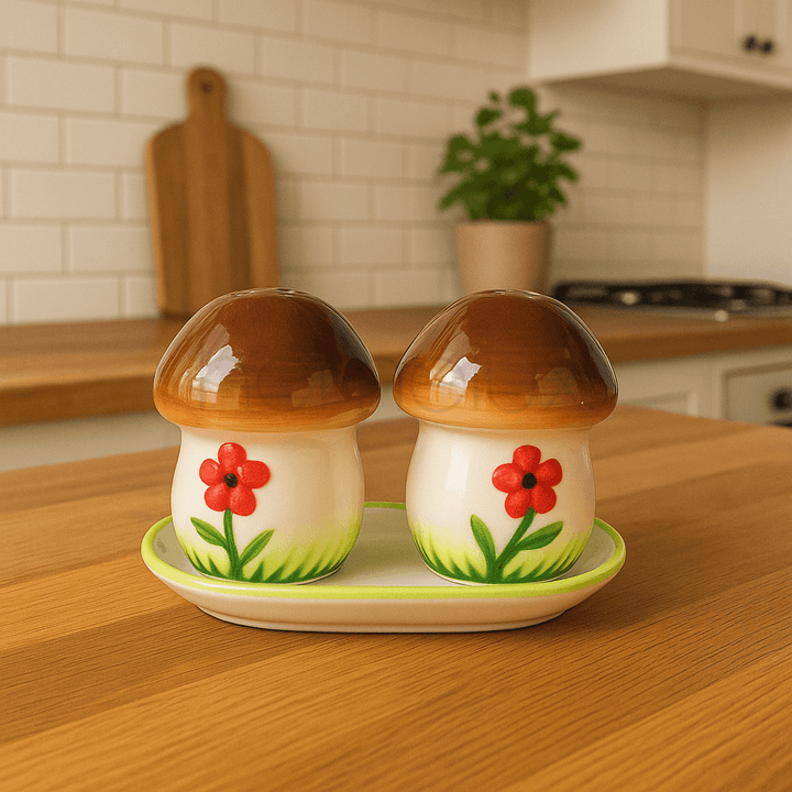 A charming and decorative set of two ceramic seasoning shakers designed to look like small mushrooms. Each shaker features a glossy brown cap and a white base hand-painted with a cheerful red flower and green stem. This whimsical set is perfect for adding a touch of rustic charm or woodland theme to your dining table or kitchen countertop. The shakers are presented on a coordinating small tray with a light green trim, keeping the set tidy and easy to pass around.