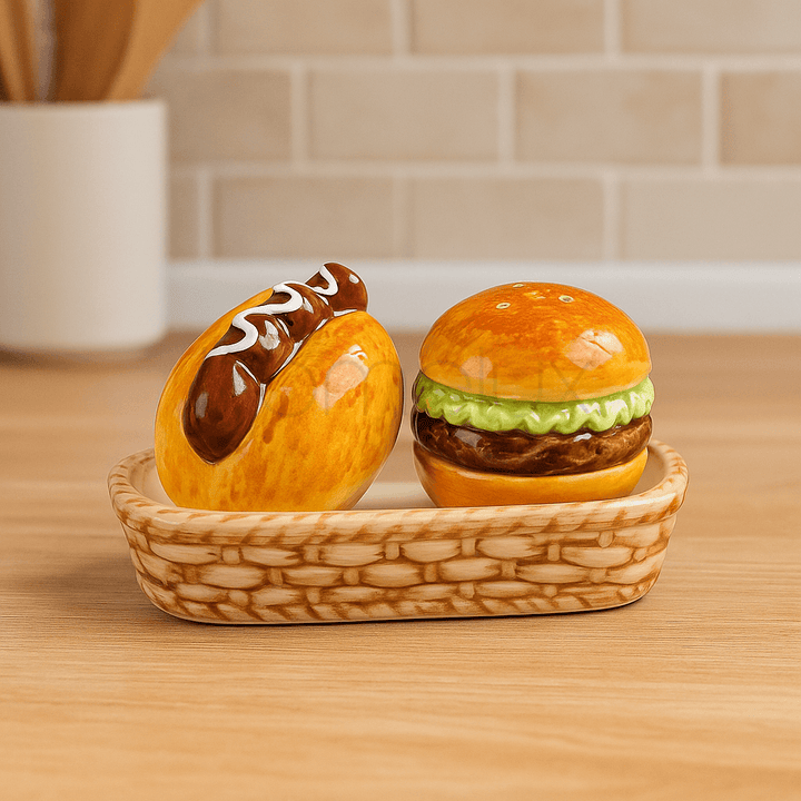 A fun and unique seasoning set that brings a playful fast-food theme to your table. The two shakers are realistically sculpted and hand-painted to resemble popular diner items: one is a hot dog topped with sauce, and the other is a burger with buns, lettuce, and meat. Both shakers sit securely in a coordinating ceramic basket-weave tray, designed to look like a rustic serving basket. This set is perfect for casual dining, BBQs, or as a quirky gift for food enthusiasts.
