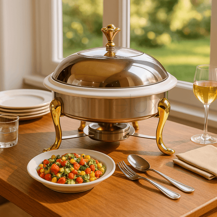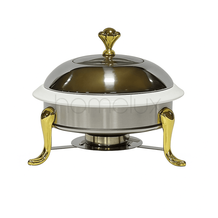 Impress your guests with the Opulent Buffet Server, a centerpiece that blends luxurious design with perfect functionality. This elegant chafing dish features a gleaming stainless steel body complemented by a majestic gold-finished stand and a decorative lid handle. It's designed to keep your food at the ideal temperature while adding a touch of grandeur to any event, from large parties to intimate gatherings.