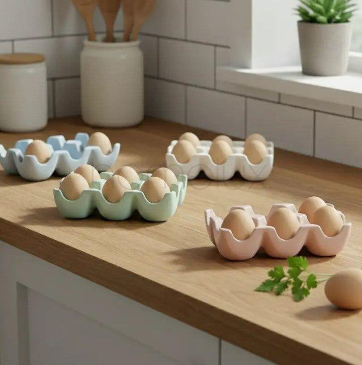 A decorative and functional ceramic egg holder designed to neatly store or serve up to six eggs. The tray features a continuous, wavy design that cradles each egg securely. Shown here in four soft, stylish pastel colors (light blue, white, mint green, and blush pink), this dish is perfect for serving boiled eggs at brunch, keeping eggs organized on the countertop, or transporting them safely from the refrigerator. Its smooth, non-porous ceramic construction makes it both elegant and easy to clean.