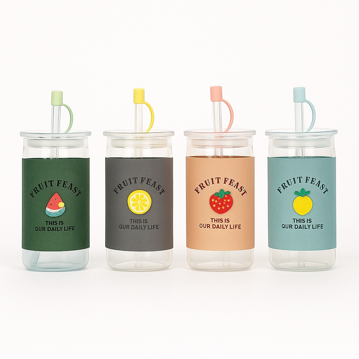 Fruit Feast Glass Cup with Straw & Leather Sleeve – 410ml
