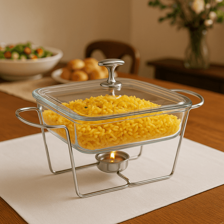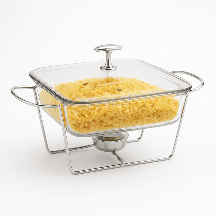 Serve your culinary creations with a touch of modern elegance using the Radiant Square Server. This stylish chafing dish features a sleek silver stand and a clear glass dish, allowing your food to be the star of the show. With a perfect 2L capacity, it's ideal for keeping casseroles, main courses, or side dishes warm and ready to serve at any family dinner or small gathering.