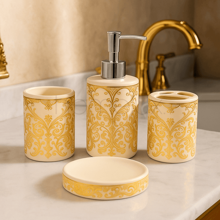 A stunning and ornate bath set featuring an elegant pale cream or ivory base richly decorated with a detailed gold butterfly and filigree lace pattern. Made from durable material (likely ceramic or resin), this collection exudes a classic, regal, and luxurious style. It includes a liquid soap dispenser with a chrome pump, a tumbler, a toothbrush holder, and a matching round soap dish. This coordinated set is perfect for adding a touch of vintage glamour or high-end elegance to your bathroom decor.