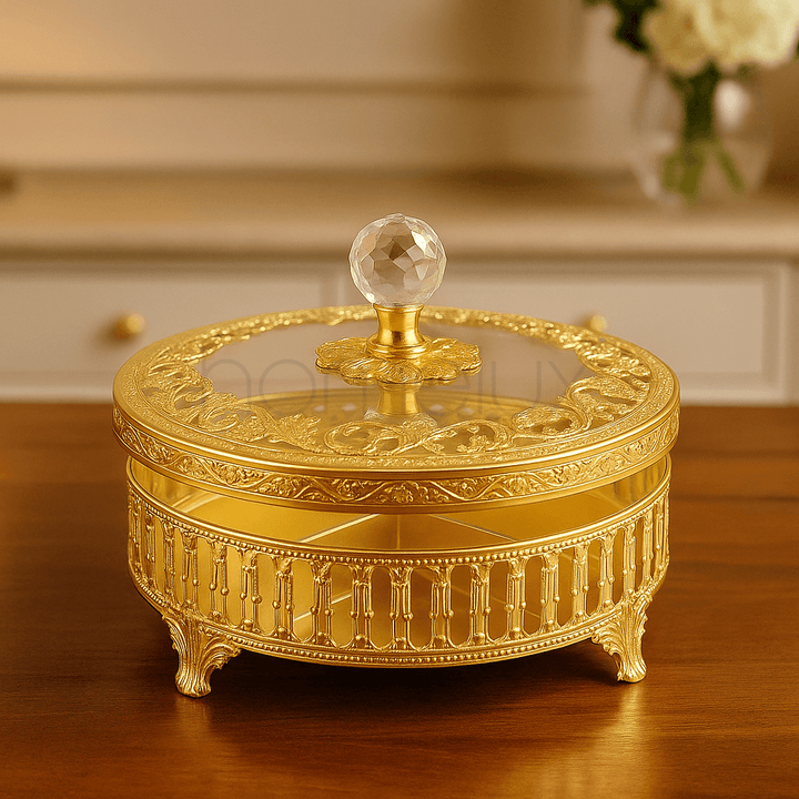 A stunning round dry fruit tray that exudes royal elegance with its intricate gold-plated design. Featuring a crystal knob lid and beautifully divided sections, it’s perfect for serving dry fruits, sweets, or snacks in the most luxurious way. This ornate piece is not only functional but also a dazzling centerpiece for festive gatherings, weddings, or home décor.
