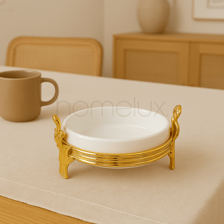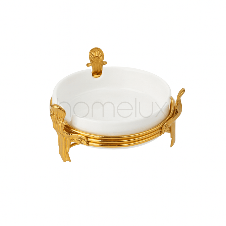 This exquisite porcelain dish is gracefully framed in lustrous gold detailing, making it a timeless addition to refined interiors. Designed with classical motifs and rich gilded accents, it serves as both a functional piece and a statement of elegance. Ideal for serving delicacies or as a decorative centrepiece, it embodies sophistication and artistry in every detail.