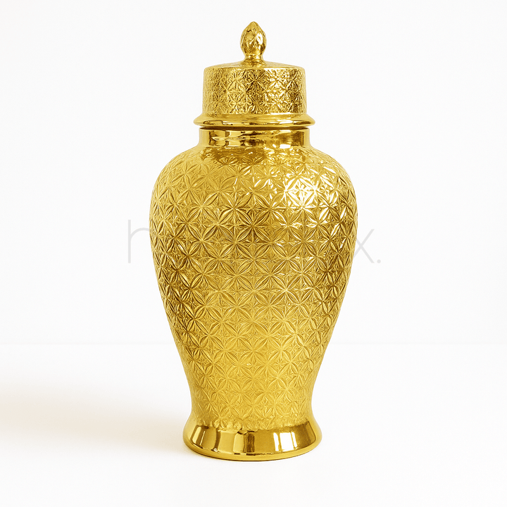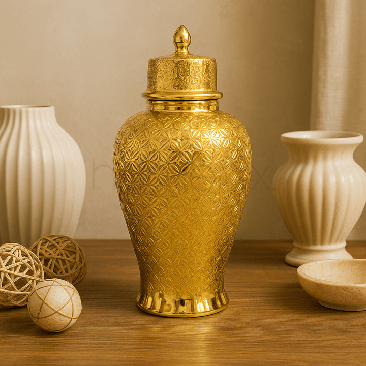 This tall, embossed golden ceramic jar is a statement of luxury and elegance. With its intricate textured detailing and high-gloss golden finish, it is designed to elevate any interior space. The lidded design ensures it serves both as a decorative centerpiece and a functional storage jar. Perfect for display on dining tables, console shelves, or as a standalone décor piece.