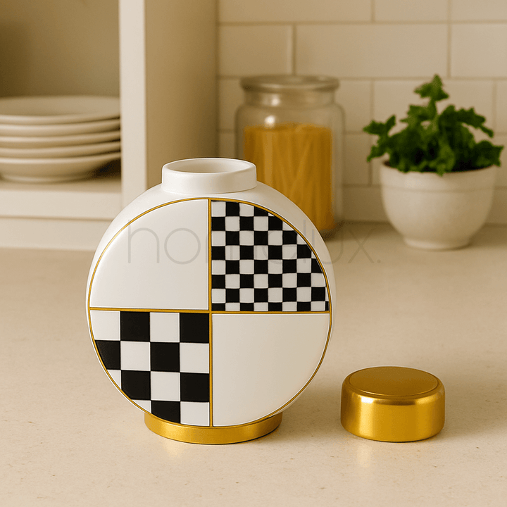 A stylish round ceramic candy jar featuring a unique quadrant design with alternating black-and-white checkered patterns, accented with golden detailing. The glossy golden lid enhances its luxurious look, making it both practical and decorative. Ideal for storing candies, cookies, dry fruits, or snacks, this jar doubles as an eye-catching centerpiece for your kitchen, dining table, or living room.