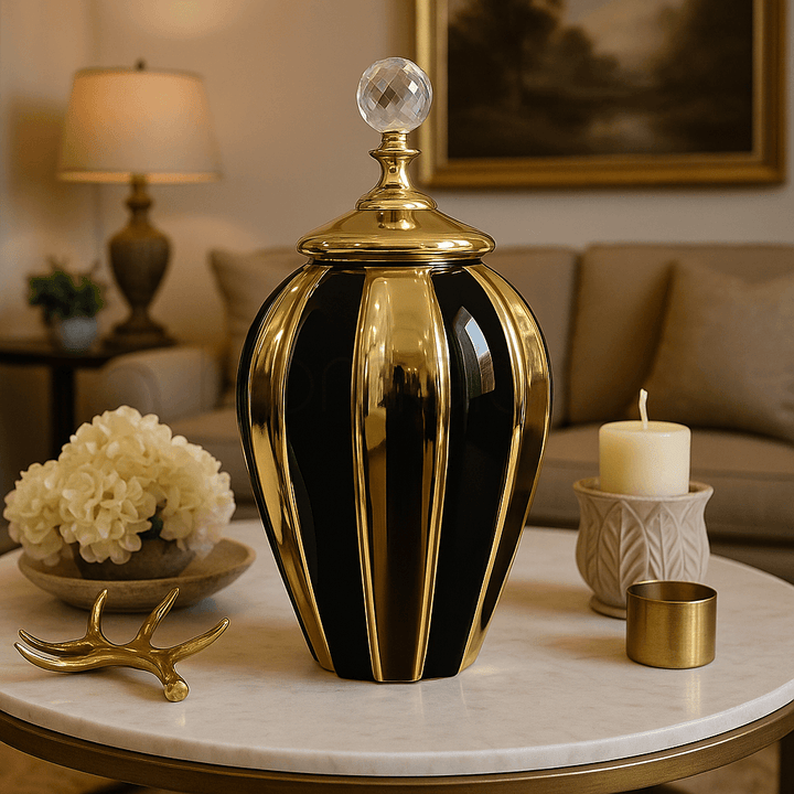 The Royal Black & Gold Crystal Jar is a statement piece that exudes elegance and sophistication. Featuring alternating glossy black and golden vertical panels, finished with a radiant crystal knob lid, this jar is the perfect blend of modern style and timeless luxury.