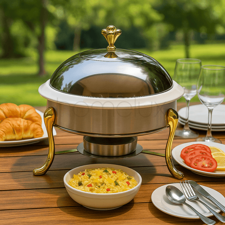 Present your dishes with sophistication using the Royal Buffet Server. This elegant chafing dish serves as a beautiful centerpiece, designed to keep your food perfectly warm while adding a touch of luxury to your table. Its sleek stainless steel body is complemented by a striking gold-finished stand and an intricately designed lid handle, making it the ideal choice for any party, buffet, or family gathering.