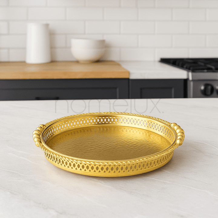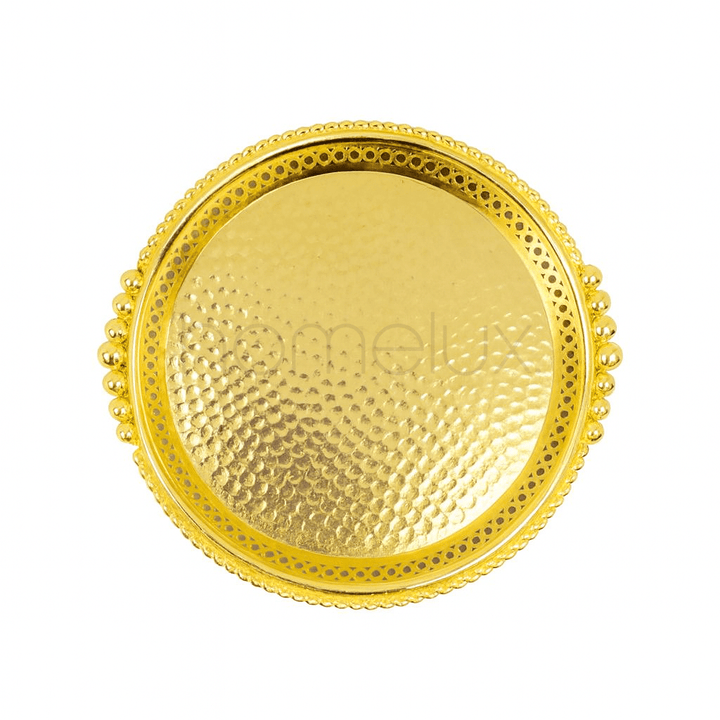Elevate your serving experience with this luxurious round brass tray, featuring a hand-hammered surface that adds texture and brilliance. The intricately designed lattice border and beaded side handles bring a touch of royal elegance, making it perfect for serving beverages, displaying décor, or enhancing your dining table. Crafted with fine detail, this tray blends traditional artistry with modern sophistication, ideal for both everyday use and special occasions.