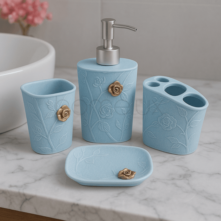 A charming and complete bath accessory set featuring a delicate floral/rose vine embossing on a light, neutral-toned base (appears grey or off-white). The set has a rustic or cottage-style finish and includes a liquid soap/lotion dispenser with a metallic pump, a tumbler (with an angled rim), a multi-slot toothbrush holder (also with an angled rim), and a matching rectangular soap dish. Small, decorative gold-toned rose accents are affixed to the pieces, adding a touch of vintage elegance and texture to your bathroom vanity.
