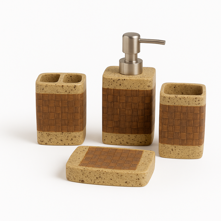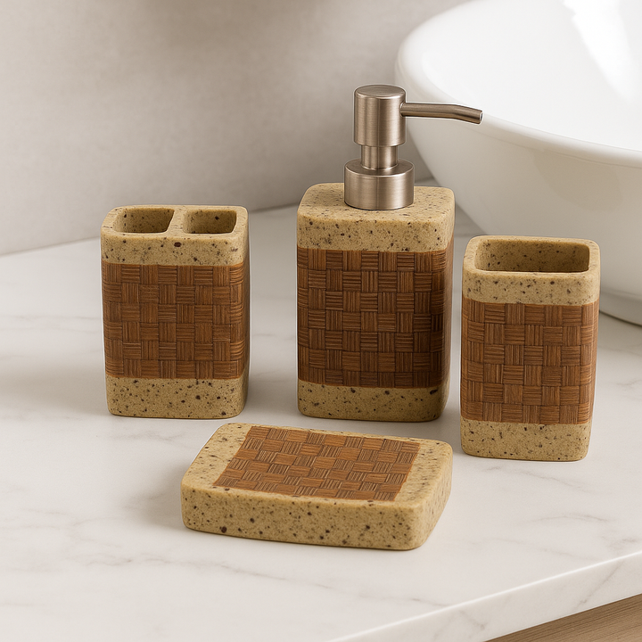 A unique and tactile bath accessory set featuring a natural, rustic aesthetic. The set has a speckled beige/light brown stone-effect base with a prominent textured woven or rattan pattern band in a darker brown color around the center of each piece. This collection includes a liquid soap/lotion dispenser with a brushed metallic pump, a tumbler, a toothbrush holder, and a matching rectangular soap dish. The natural tones and distinct woven texture add a grounding, earthy, and casual feel to any bathroom or spa space.