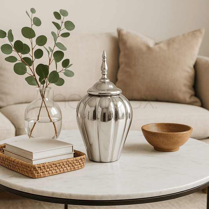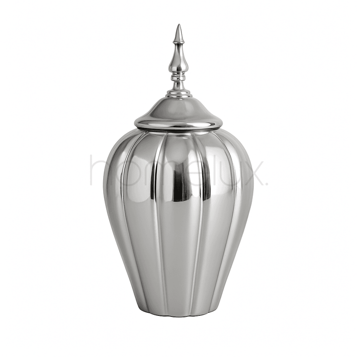 The Silver Luxe Pumpkin Jar is a sophisticated decor piece with a mirror-like silver finish and a unique pumpkin-inspired silhouette. Its pointed finial lid adds a regal touch, making it a stunning centerpiece for any modern or traditional setting.