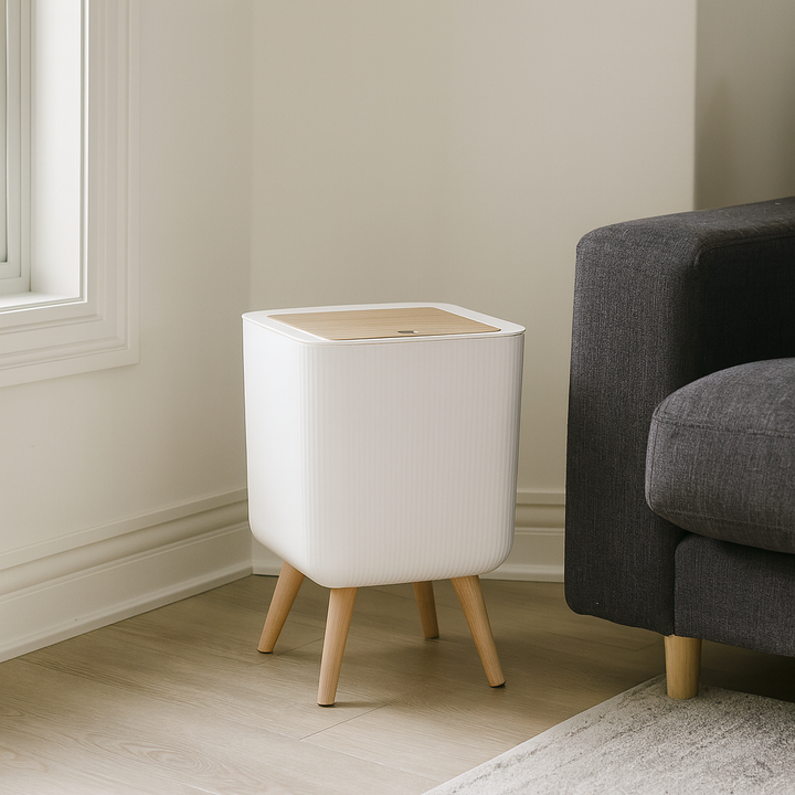 Bring a touch of Nordic elegance to your home with this Square Frosted Plastic Dustbin. Designed with a minimalistic square silhouette, ribbed frosted texture, and natural wooden legs, it effortlessly blends into both bright and dark-toned interiors. The wooden swing-top lid keeps waste discreet while maintaining a clean, upscale appearance. Perfect for modern lounges, bedrooms, kitchens, offices, and studio spaces, this stylish dustbin doubles as a décor element that elevates your interior atmosphere.