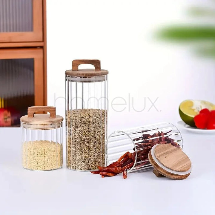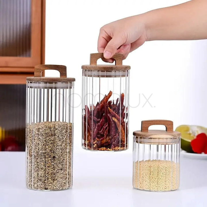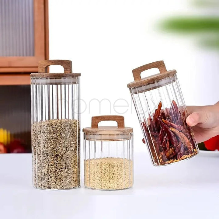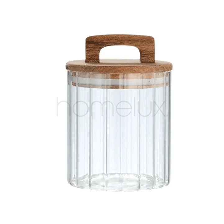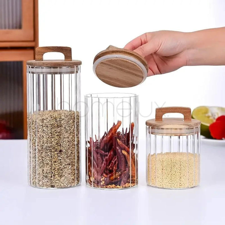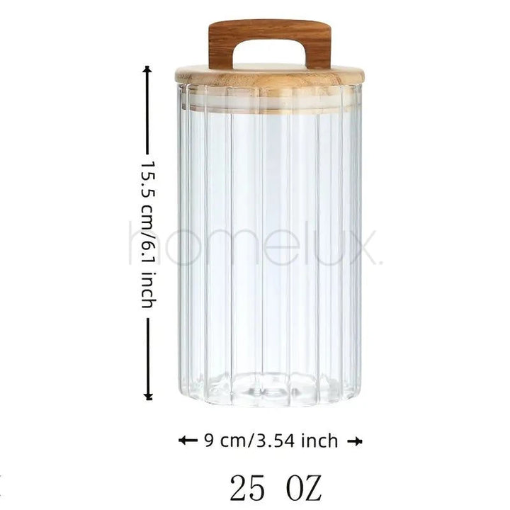Striped Glass Seasoning Jar with Bamboo Lid, Round Storage Container for Kitchen, Coffee, Tea, Snacks, Candy, Biscuits, Milk Powder, Pet Food - Novelty Theme, Includes Lid