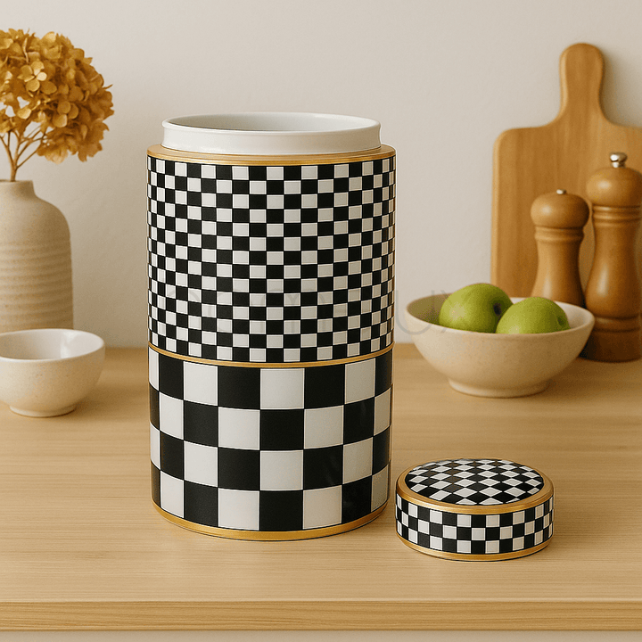 An elegant tall ceramic candy jar with a striking black-and-white checkered design, highlighted by golden accents. Its sleek cylindrical shape and secure lid make it ideal for storing candies, cookies, dry fruits, or snacks while doubling as a stylish decorative piece for your kitchen, dining area, or living room. The bold pattern adds a modern yet classic touch to your home décor.