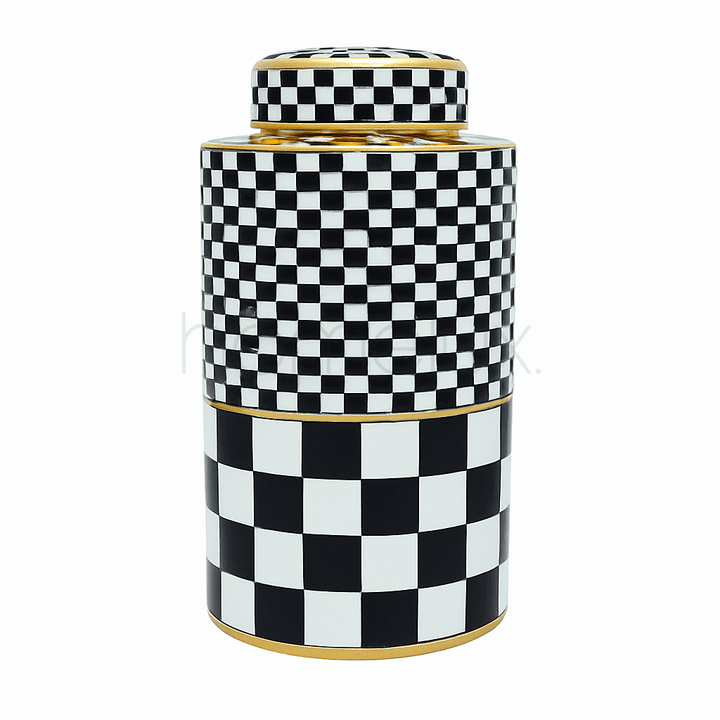 - Design: Tall cylindrical jar with checkered pattern and golden detailing