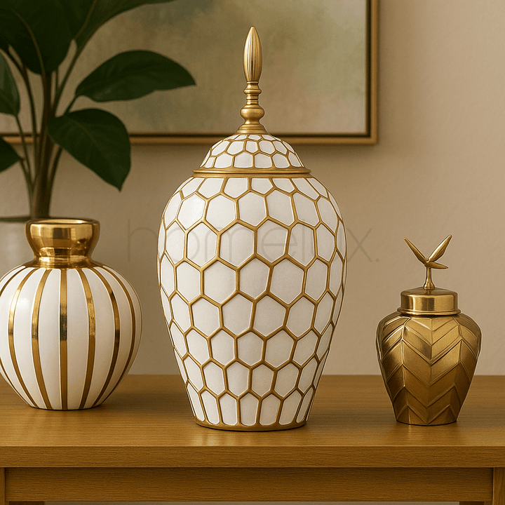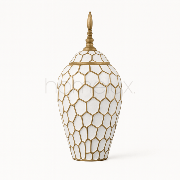 An exquisite tall ceramic jar featuring a honeycomb-inspired mosaic pattern with metallic outlines. Its glossy white surface, antique-style lid, and detailed finial make it a statement luxury piece for both decoration and functional use as a candy jar.
