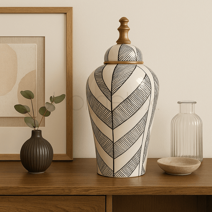 A sophisticated tall ceramic jar featuring an elongated silhouette with a hand-drawn leaf pattern in black on a glossy white surface. The design flows seamlessly onto the domed lid, topped with a classic wooden-tone finial and a golden rim for added elegance. This decorative jar is perfect for use as a statement centerpiece, shelf décor, or as a stylish storage container for your home.