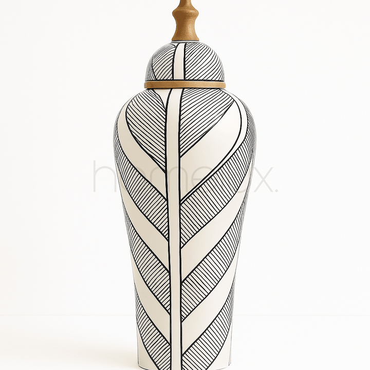 An elegant tall ceramic jar designed with a hand-drawn black leaf motif on a glossy white surface. The jar features a dome lid with a golden rim and a finely crafted wooden finial, adding a touch of sophistication. Its elongated shape makes it a perfect statement piece for home décor, whether placed on a console table, dining shelf, or living room corner.