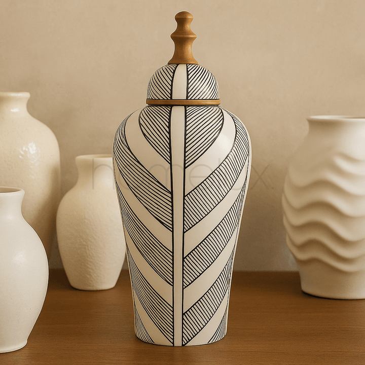 Tall Leaf Pattern Ceramic Jar with Wooden Finial