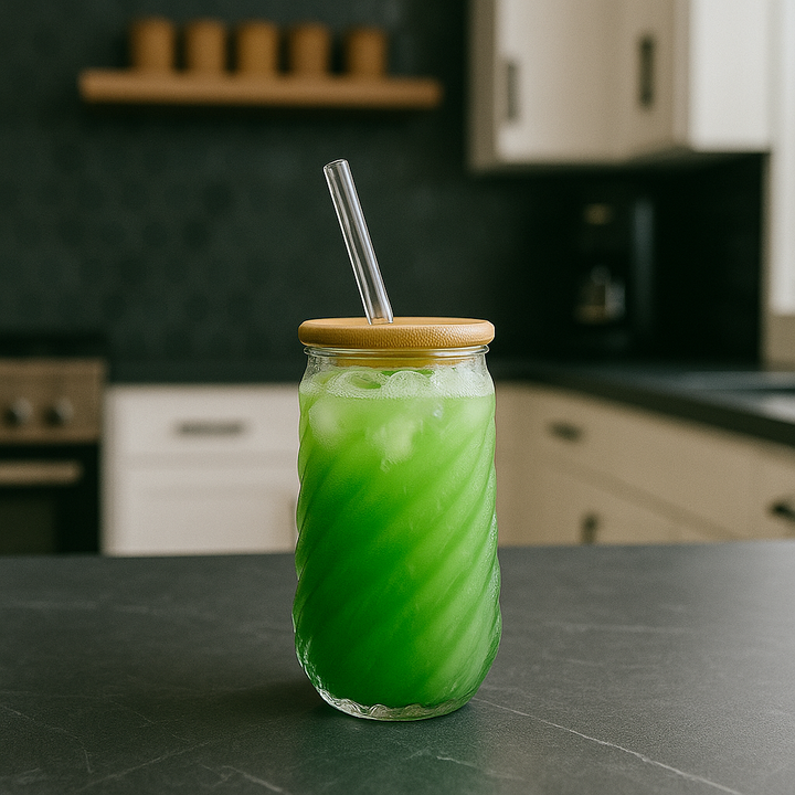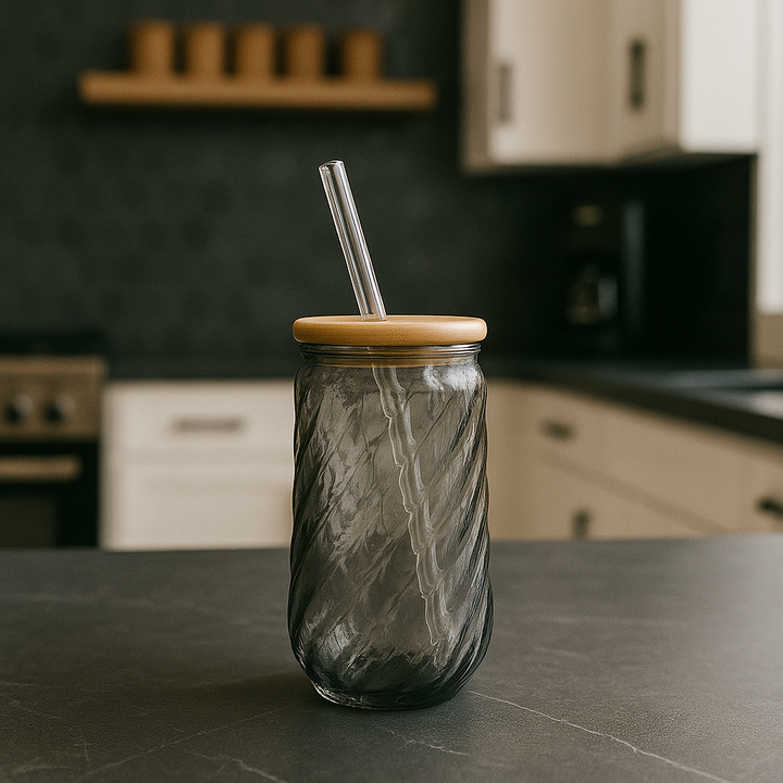 This distinctive drinking glass elevates the typical tumbler design with a unique, eye-catching twisted swirl texture molded into the glass body. The tactile, raised pattern not only adds a modern aesthetic flair but also provides an enhanced grip. Appearing to be tinted a deep, smoky grey or brown, this robust glass is perfectly complemented by a natural bamboo lid and a reusable drinking straw. It's an ideal piece for serving cocktails, iced beverages, or sparkling water, offering both style and substance.
