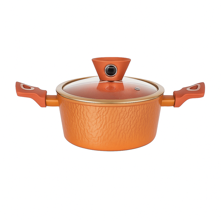 This gorgeous stockpot brings a cozy, artisanal warmth to your kitchen with its captivating hammered copper-tone exterior. The unique texture is complemented by sleek, ergonomic handles and a matching lid knob, creating a high-end, rustic-chic aesthetic. Inside, a durable, non-stick cooking surface ensures superior heat distribution and makes clean-up a breeze. Perfect for simmering soups, boiling pasta, or preparing hearty stews with unmistakable style.