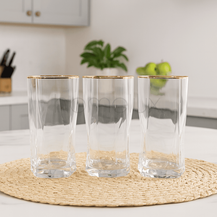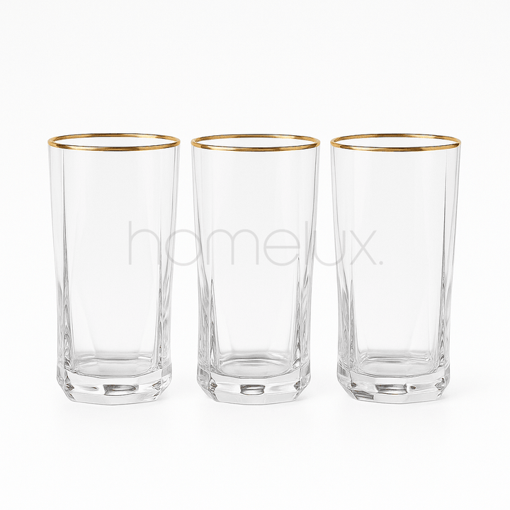 A distinguished set of six tall glasses perfect for serving highballs, juice, or premium mixed drinks. The body features bold, multi-angled geometric faceting, creating sharp reflections, while a fine gold band elevates the top edge with luxurious contrast.