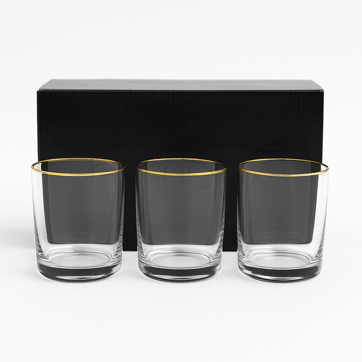 This essential set of six lowball glasses combines everyday practicality with a touch of understated luxury. Featuring smooth, slightly tapering sides that lead to a substantial, solid base, each glass is topped with a crisp, fine gold band for a sophisticated finish.