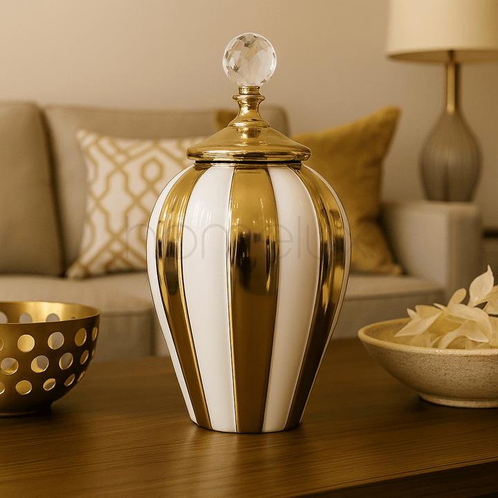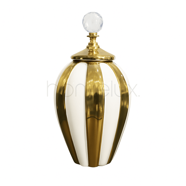 The White & Gold Crystal Finial Jar is a luxurious decor piece that radiates sophistication. With alternating glossy white and golden vertical panels, crowned with a sparkling crystal knob lid, this jar adds elegance and modern charm to any setting. Perfect for display in living rooms, lounges, or dining spaces.