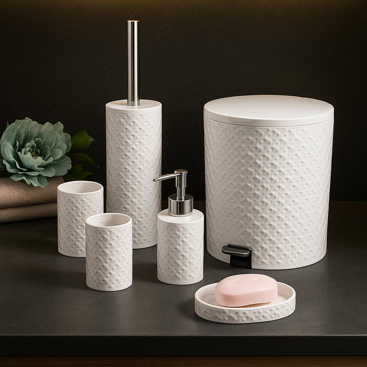 6 pieces bathroom accessories set includes toothbrush cup, soap dispenser, soap dish, toilet brush holder, trash can with Lid, Tissue holder to meet different needs.